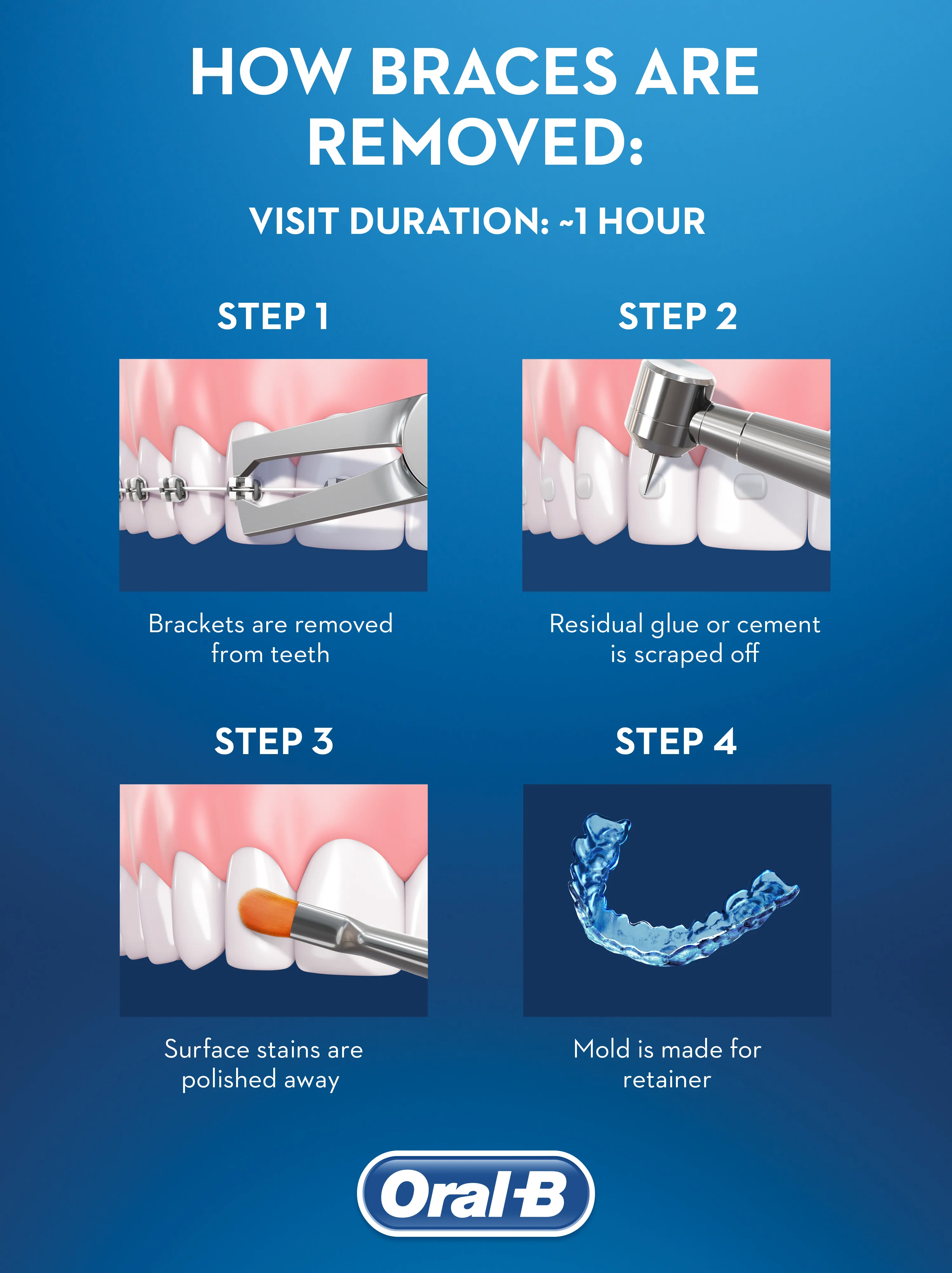 The orthodontist will use pliers to remove all the brackets, thoroughly scrape and clean all the glue off your teeth, and take a mold for your new retainer.