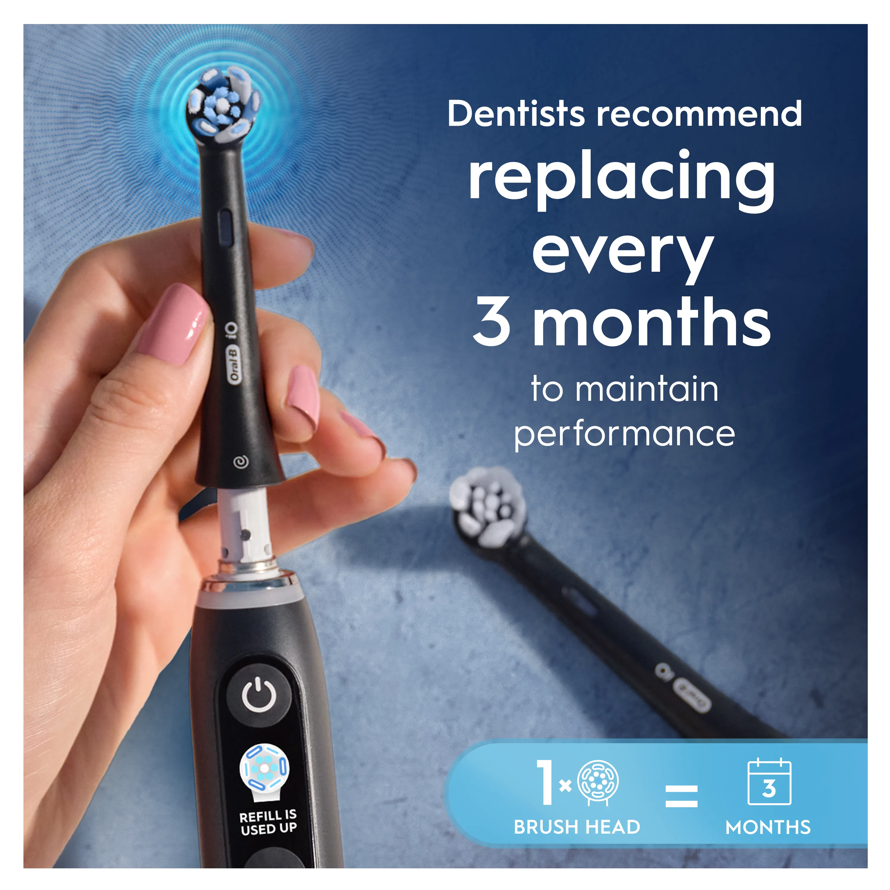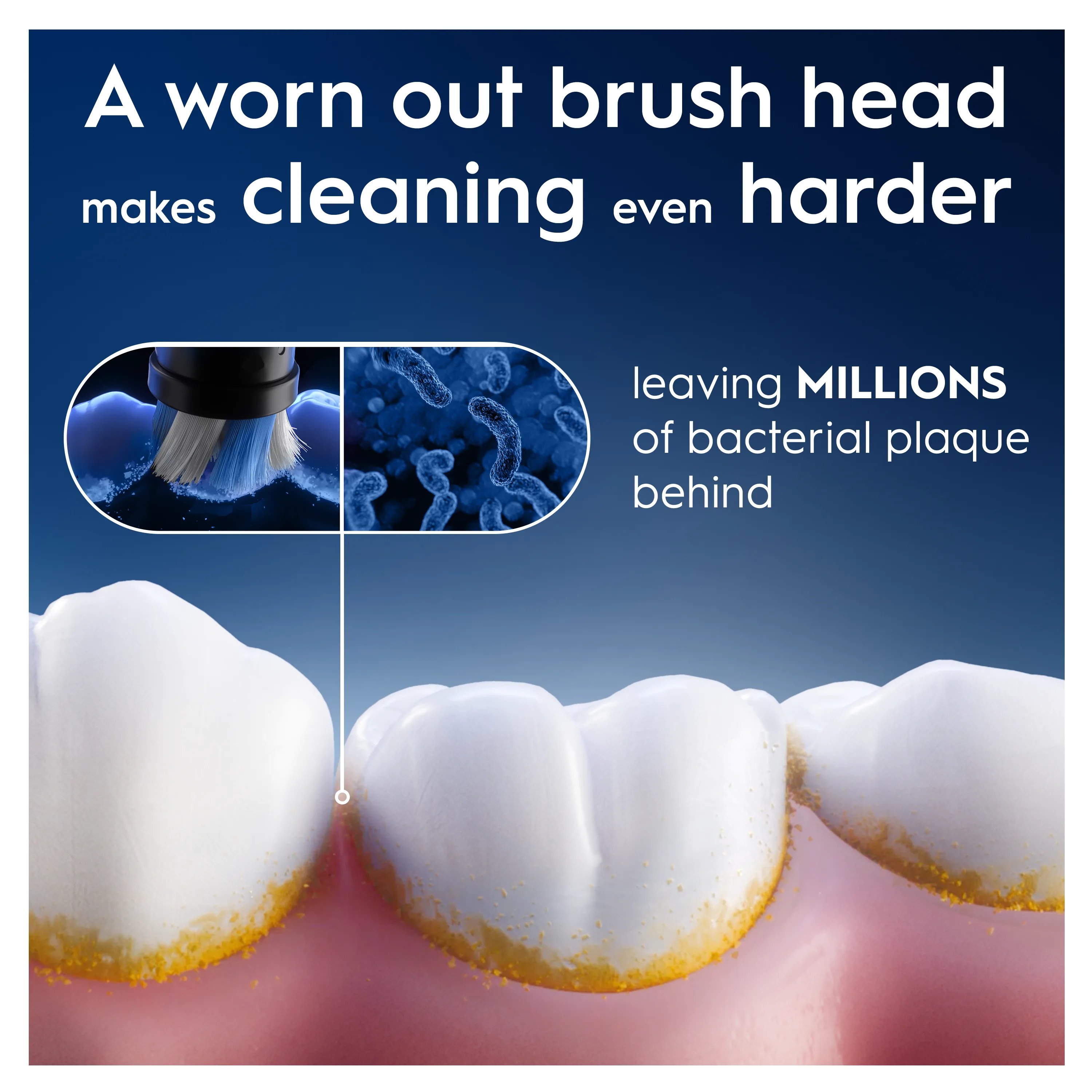 REPLACE EVERY 3 MONTHS: A worn-out brush head makes cleaning difficult, leaving bacterial plaque behind. For a superior clean, replace your brush head when the bristles fade to white