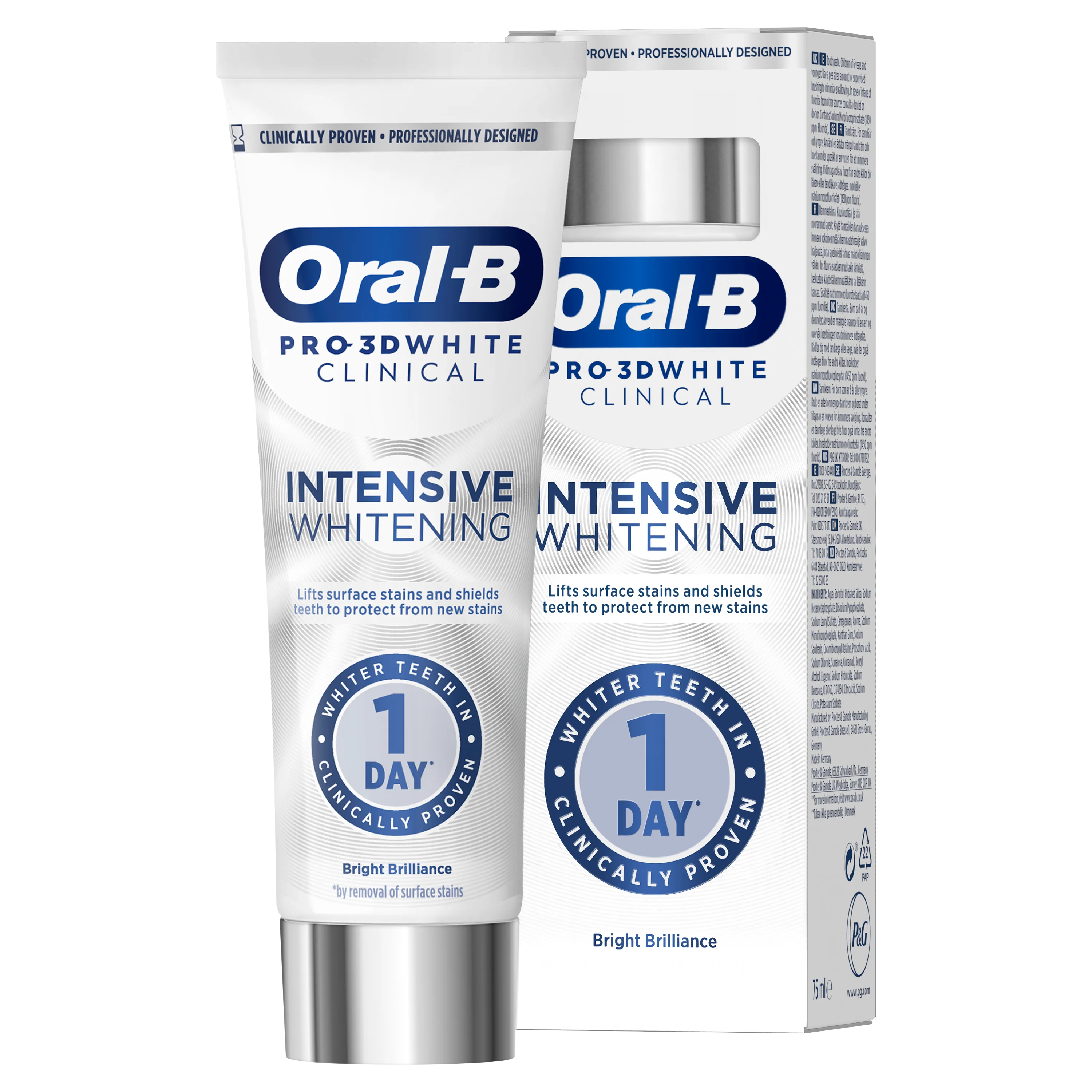 Oral-B Pro-3D White Clinical Intensive Whitening toothpaste is clinically proven for whiter teeth in 1 day by removal of surface stains. It is Oral-B’s best whitening toothpaste with its unique Ionic Technology: It loosens stains without scrubbing, removes stains with Ionic Whitening, protects teeth from future stains and is suitable for sensitive teeth.