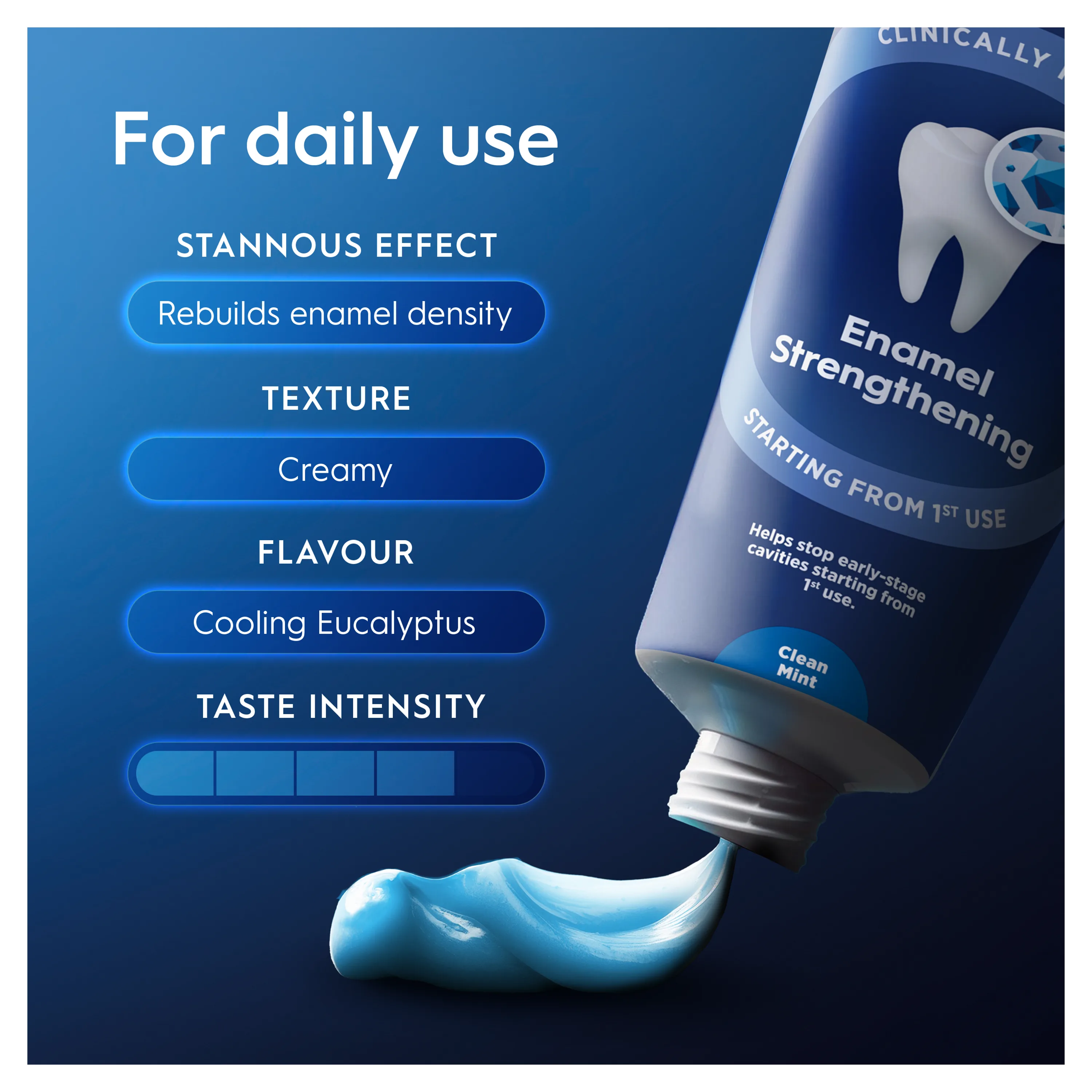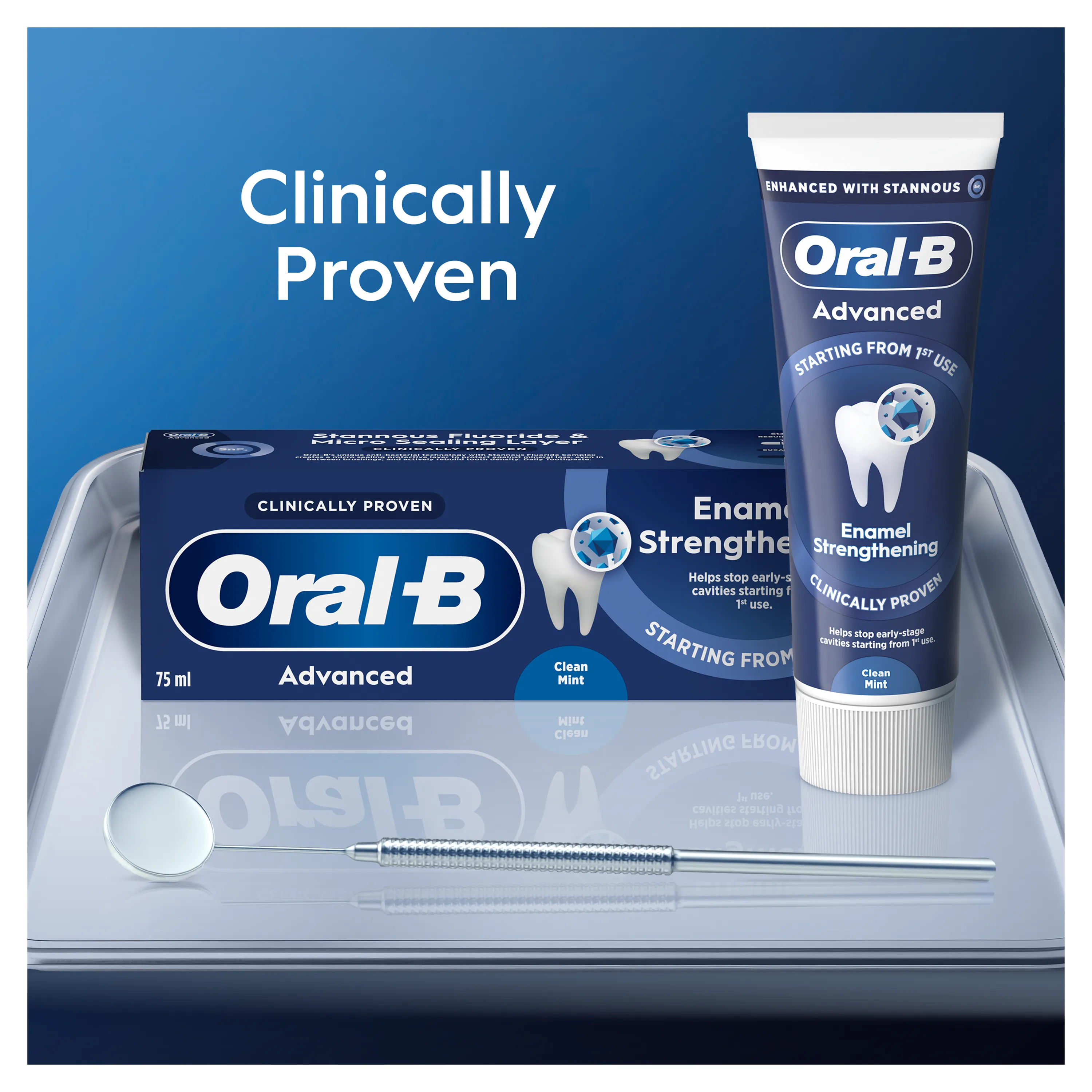 Oral-B Advanced Enamel Strengthening Clean Mint toothpaste is clinically proven to help stop early-stage cavities starting from first use. Unique anti-bacterial technology with Stannous Fluoride Complex creates a micro sealing protective layer to protect against mineral loss even in between brushing, and actively rebuild tooth density.